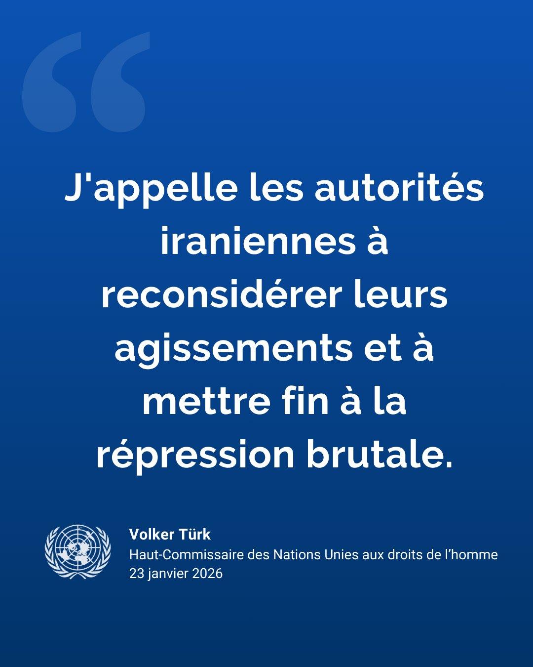 https://www.ohchr.org/fr/press-releases/2026/01/human-rights-council-hold-special-session-iran-23-january-2026?fbclid=IwY2xjawPg12ZleHRuA2FlbQIxMABicmlkETFmV2syY1pBUjlsS1ViVVVUc3J0YwZhcHBfaWQQMjIyMDM5MTc4ODIwMDg5MgABHmpkQF0FRRPzgP-G1snBzSdffbWWHd0ebJ2EP_ql4dGTcFbmbG0aat5LR0Em_aem_FWOz26049ZJTTuGshbzGYA« La répression violente du peuple iranien ne résout aucun des problèmes du pays. Au contraire, elle crée les conditions propices à de nouvelles violations des droits humains, à l'instabilité et à des effusions de sang. » Vendredi, Volker Türk, chef du Haut-Commissariat des Nations Unies aux droits de l'homme, a lancé un appel urgent aux autorités iraniennes pour qu'elles reconsidèrent, retirent et mettent fin à la répression brutale, et qu’elles libèrent immédiatement toutes les personnes détenues arbitrairement. https://www.ohchr.org/fr/press-releases/2026/01/human-rights-council-hold-special-session-iran-23-january-2026?fbclid=IwY2xjawPg12ZleHRuA2FlbQIxMABicmlkETFmV2syY1pBUjlsS1ViVVVUc3J0YwZhcHBfaWQQMjIyMDM5MTc4ODIwMDg5MgABHmpkQF0FRRPzgP-G1snBzSdffbWWHd0ebJ2EP_ql4dGTcFbmbG0aat5LR0Em_aem_FWOz26049ZJTTuGshbzGYA0 Commentaires 0 Parts 13 Vue 0 AvisConnectez-vous pour aimer, partager et commenter! -